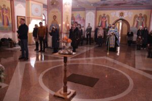 Вечерняя служба — всенощное бдение проходило в храме Святых Царственных страстотерпцев. Службу возглавил иерей Владимир Коблов, ему сослужил игумен Серафим Кузьминов.